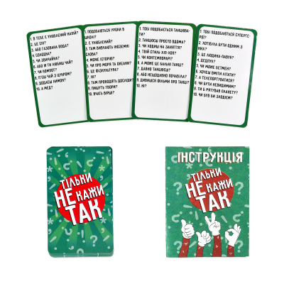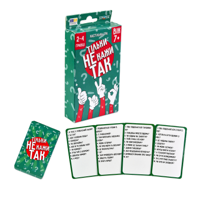"Тільки не кажи Так" — весела гра, у якій слова "Так" і "Ні" заборонені! Тягніть картку і швидко відповідайте на прості питання, оминайте "так" і "ні" та ставайте переможцем. Проявіть кмітливість й увесь словниковий запас, аби ввести суперників в оману!♦ Вік: 7+♦ Розміри: 14,5х7,9х2♦ Вага: 76 г♦ Комплектація: коробка, картки, інструкція