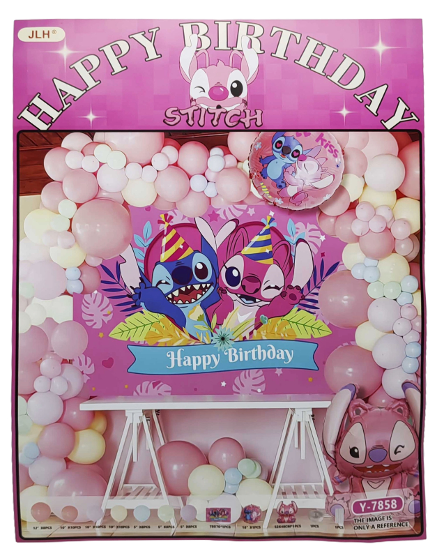 Фотозона з повітряних куль 67шт. ʺHappy Birthdayʺ Стіч, плакат-рожева №7858