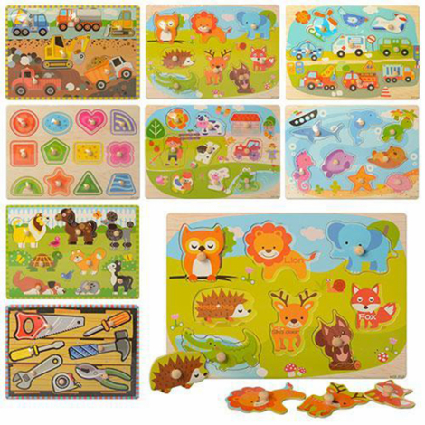 Дерев'яна рамка-вкладиш MD1187, пазли, тварини, транспорт, фігури, у плівці 30*22*2см.