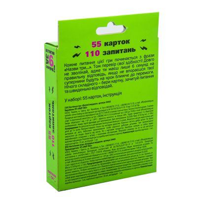 Неймовірна карткова гра «Встигни за 6 секунд» передбачає швидкі відповіді на короткі запитання. Так на кожній картці є по дві умови, які починаються зі слів «Назви три ...», а що саме назвати дізнаєтеся в процесі гри. Це можуть бути овочі, актори, ігри, професії, свята і багато іншого. Процес гри досить простий, але дуже цікавий. Кмітливість, швидкість, логічне мислення – те, що обов"язково стане в нагоді вам у грі «Встигни за 6 секунд» Strateg (30403)!♦ Рекомендований вік гравців: 7+♦ Размір пакування: 13,9х9х2,2 см;♦ Комплектація гри: 55 картонних карток, паперова інструкція;♦ Вага гри в коробці: 150 г (+-20 г);♦ Кількість гравців: 3-8.Гра українською мовою.