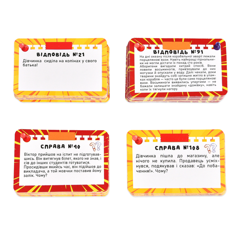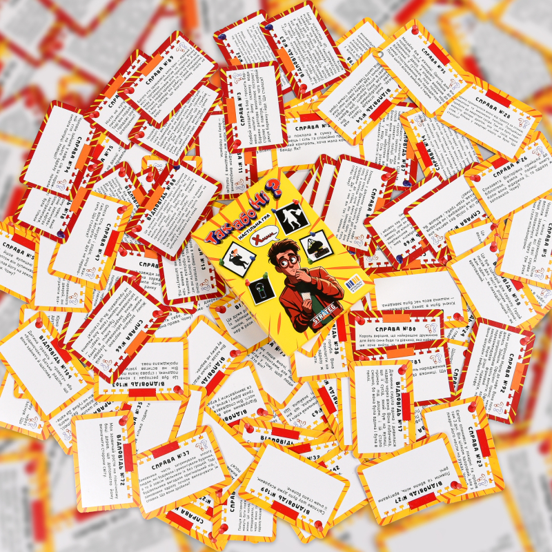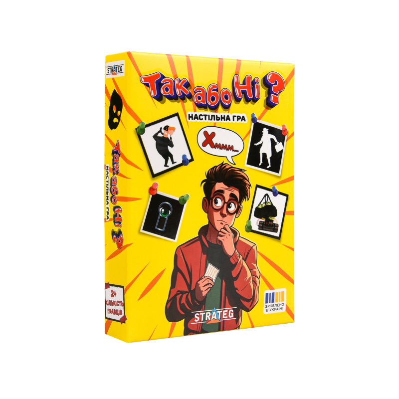 Настільна гра: «Так або ні?» (30942)Відчуйте азарт справжнього розслідування!«Так або ні?» — це захоплива детективна пригода, в якій ви станете командою справжніх детективів. У коробці низка загадкових історій, які на перший погляд здаються абсурдними або неможливими. Ваше завдання: крок за кроком розплутати клубок подій і дізнатися, що сталося насправді.Один із гравців зачитує загадку з картки, а решта учасників стають детективами, які намагаються відновити повну картину події. Шлях до істини лежить через правильні запитання, на які можна відповідати лише «так» або «ні».Великий запас історій, два рівні складності та ергономічний формат розворушать ваші мізки на повну!Вік: 14+Кількість гравців: 2+Розмір коробки: 14 х 10,1 х 2,5 смВага: 200 гКомплектація: коробка, картки — 110 шт., картка з QR-кодом (посилання на інструкцію).