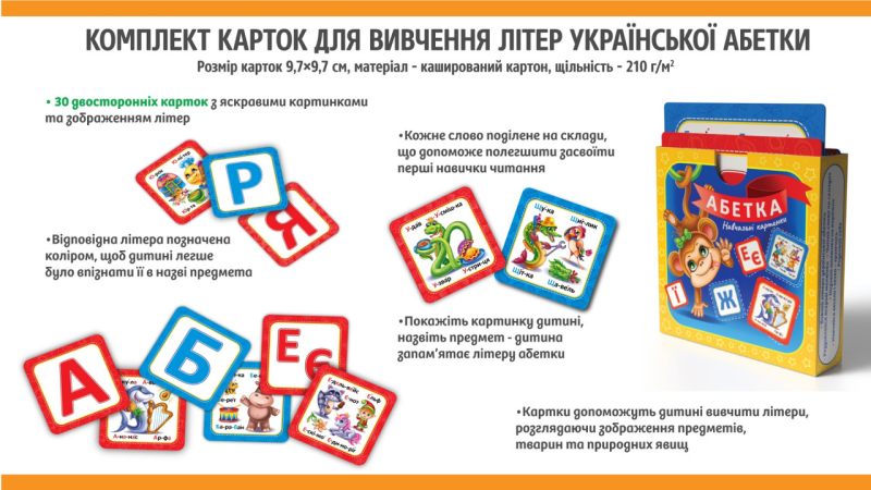 Купити Навчальні картки Абетка NAK-01 Ви можете в нашому інтернет-магазині, зробивши замовлення, і ми доставимо його до будь-якої точки України, докладніше про доставку.