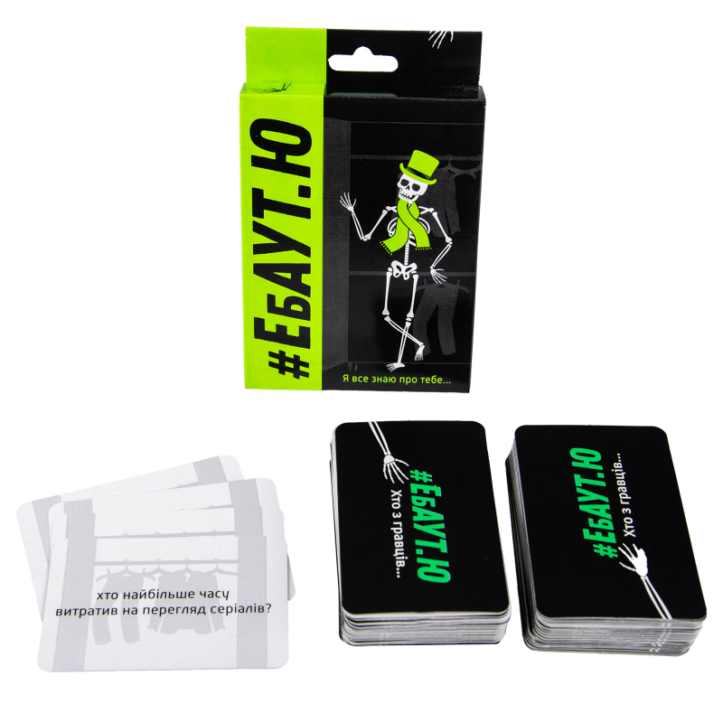 «Ебаут.Ю» – гра для компанії від 3 до 12 гравців, які полюбляють цікаві факти одне про одного. У грі 110 карток з різними твердженнями, які комусь можуть здатися смішними, а комусь дивними. Оптимальний вік гравців – від 15 років, адже деякі факти на картках дійсно гостренькі. Кожному гравцеві доведеться вирішувати, кому з супротивників підходить той чи інший факт та віддавати відповідні картки. Мета гри «Ебаут.Ю» Strateg (30520) – отримати якомога менше карток. Комплектація гри: картонна коробка розміром 13,5х9х2,2 см, 110 карток з картону, паперова інструкція. Вага гри в коробці: 150 г (+-20 г). Рекомендований вік гравців: від 16 років. Кількість гравців: 3-12. Гра українською мовою.