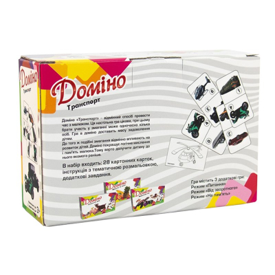 «Доміно Транспорт» - всім відома настільна гра в новому навчальному форматі. Тепер гри стали не тільки веселими, а й корисними. Граючи, дитина познайомиться з різними видами транспорту, поліпшить свою уважність і посидючість. Також в наборі є додаткові завдання, які допоможуть закріпити отримані знання! вік 3+ Кількість гравців 2-4 Комплектація: картки - 28 штук, інструкція-розмальовка, додаткові завдання.Габарити: довжина17.5 Габарити: ширина 11.8 Габарити: висота 5.6см.