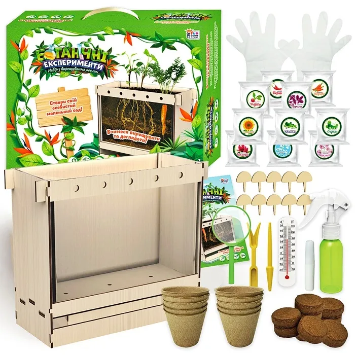 Набір ʺБотанічні експериментиʺ 70228, бокс з прозорою стороною, горщики, аксесуари, у коробці 36*26*9см.