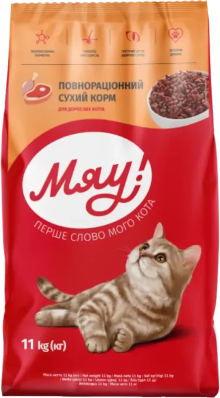 Купити Сухий корм для котів 11кг. МЯУ ʺЯловичинаʺ Ви можете в нашому інтернет-магазині, зробивши замовлення, і ми доставимо його до будь-якої точки України, докладніше про доставку.