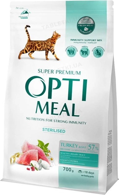 Сухий корм для стерилізован. кішок та кастрован. котів 0,7кг. OPTIMEAL ʺІндичка та овесʺ
