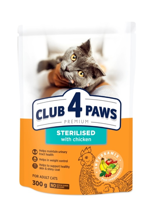 Купити Сухий корм для котів 0,3кг. Club 4 Paws ʺСтерилізованіʺ Ви можете в нашому інтернет-магазині, зробивши замовлення, і ми доставимо його до будь-якої точки України, докладніше про доставку.