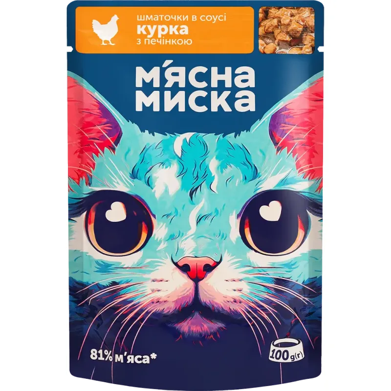 М'ясна миска, шматочки у соусі для котів, з куркою та печінкою, 100гр.