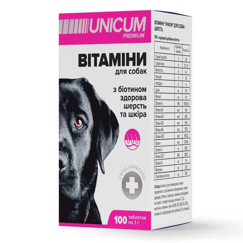 Вітаміни UNICUM premium для собак, здорова шерсть та шкіра, 100 таблеток 100гр.