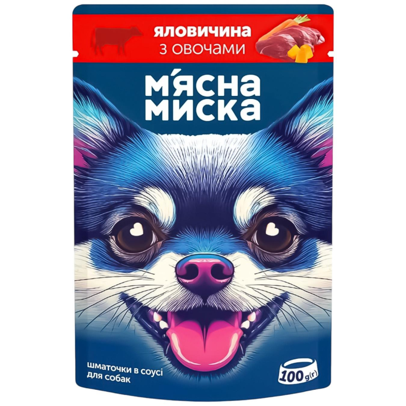 М'ясна миска, шматочки в соусі для собак, яловичина з овочами, 100гр.
